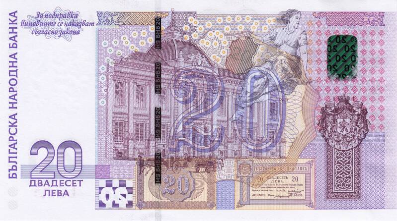 Ce billet a été émis pour célébrer le 120ème anniversaire du premier billet de banque bulgare ;au recto, des éléments stylisés représentent le bâtiment de la Banque Nationale de Bulgarie. Au recto, nous trouvons une réplique du premier billet bulgare de 20 BGN émis en 1885. Ce billet de banque a été produit à 250'000 exemplaires.